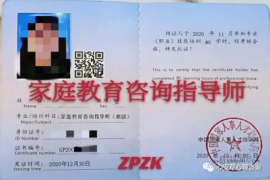 学员修完全部课程,须参加由中国国家人事人才培训网   考试中心组织的集中考试。经考核合格,由中国国家人事人才培训网颁发“家庭教育咨询指导师”培训证书,证书编号唯一,可通过扫描二维码或者直接进入http://chinanet.mohrss.gov.cn/(人力资源和社会保障部中国国家人事人才培训网)查询。用人单位可根据此证了解专业技术人员接受培训的情况,作为能力评价、考核、聘用和继续教育学时等的重要依据。(证书见下图样式)