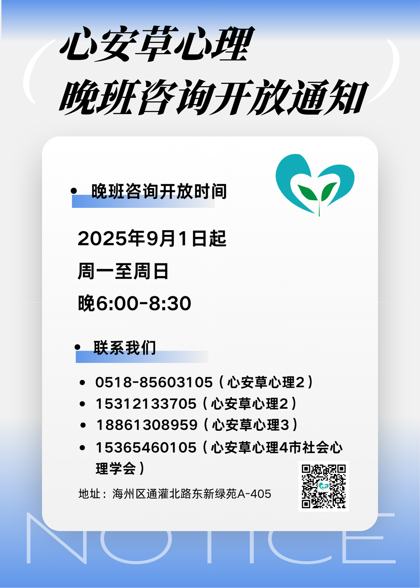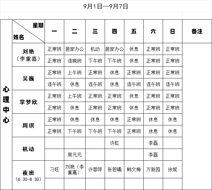 心安草晚班咨询开放通知暨排班表
