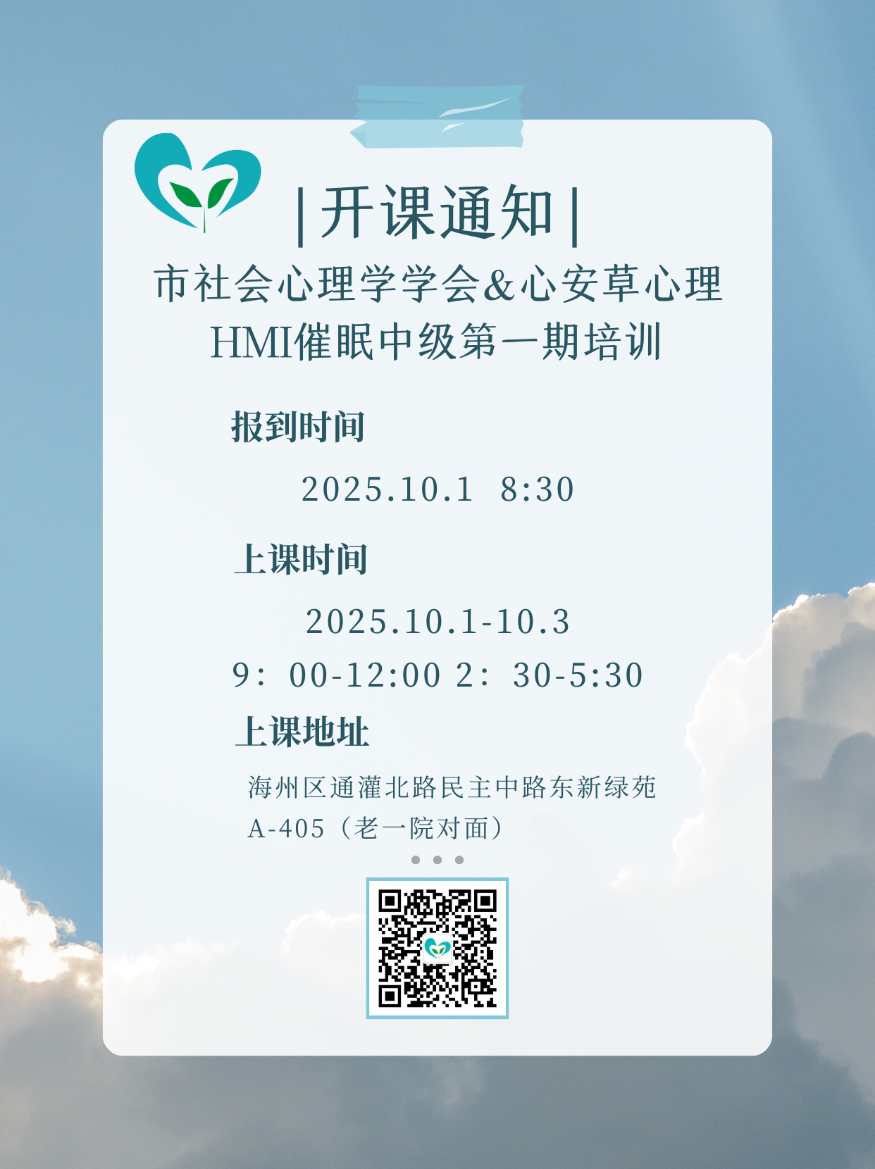市社会心理学学会&心安草心理HMI催眠中级第一期培训开课通知