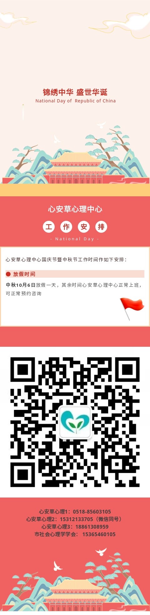 心安草心理中心国庆中秋工作时间安排