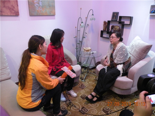 上图为黄欣主持人、断臂女孩与李老师交流场景。